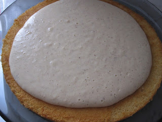 Pour one half of the mixture over one layer of a cake base. It should be thick, and not too liquid. Don't let it go all the way out to the edges. Put another cake layer on top. Gently press it and the cream will start reaching the sides. Pour the other half of the filling over and repeat with the last layer of cake.